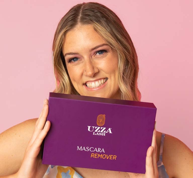 UZZA Lash Eye Makeup Remover - Waterproof Mascara Remover for Sensitive Eyes - Natural Make up Remover - Hygienic Kit Includes Eyelash Brush, Reusable Pads, Cleanser Liquid 1oz
