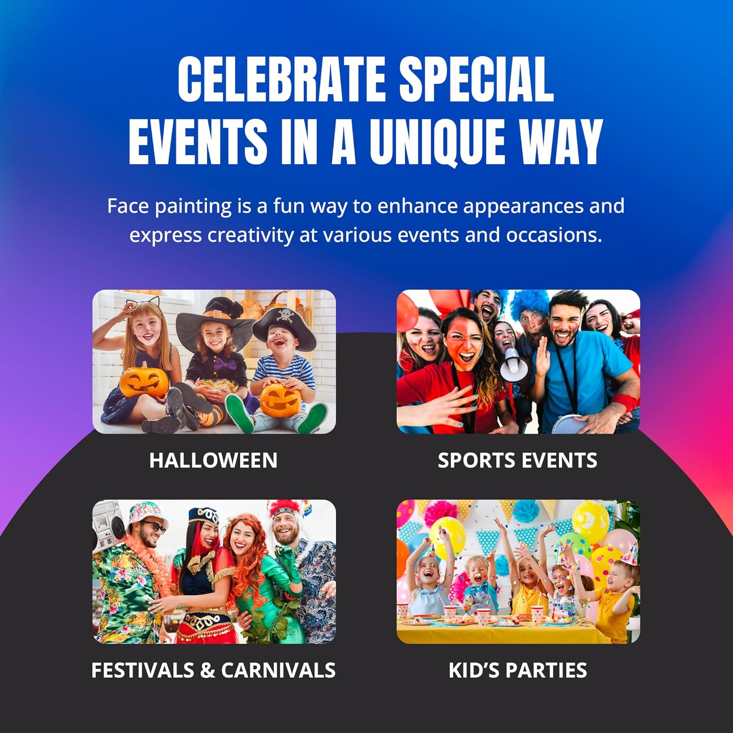 - Suitable for All: Whether you're just starting or a seasoned face painter, our water-activated face paint set caters to all skill levels. Make every face painting experience truly memorable, whether on stage or at home!