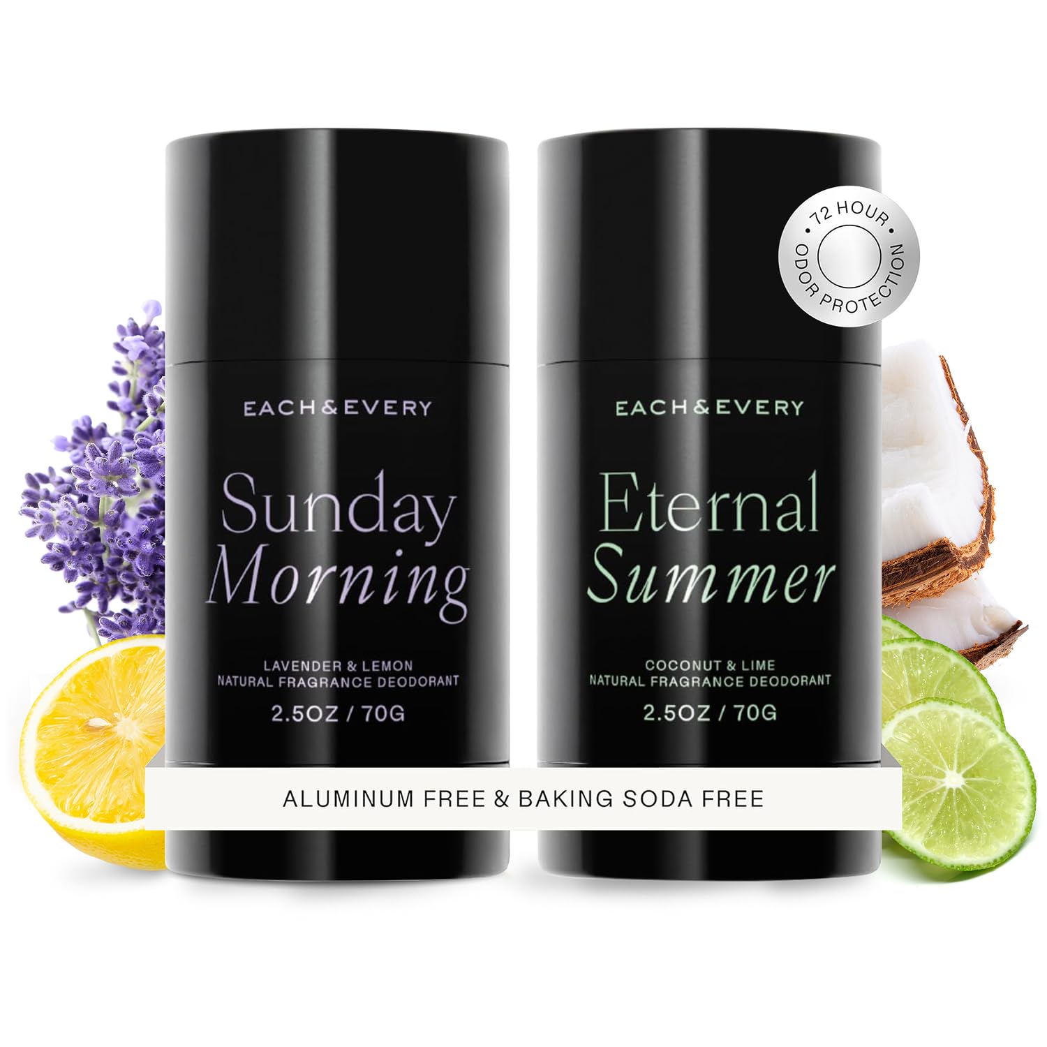 Each & Every Aluminum Free Deodorant for Women & Men, Lavender & Lemon + Coconut & Lime - All Natural Deodorant for Sensitive Skin, EWG Verified - Clean, Baking Soda-Free, Plant-Based - 2.5oz, 2 Pack