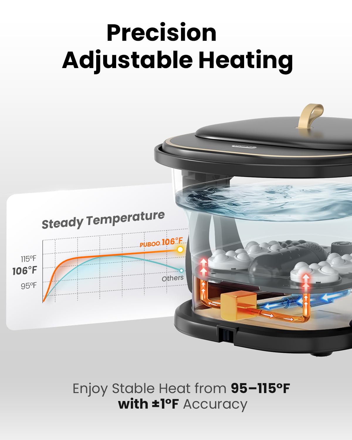 - Consistent and Adjustable Heating: Enjoy precise temperature control between 95°F–115°F with 1°F accuracy. The foot bath massager uses bottom water circulation heating to evenly warm the entire tub and automatically reheats as needed—no more refilling with hot water. Please note: the heating function cannot be turned off during use while the minimum temperature can only reach to 95℉, and the unit is not designed for cold water circulation. Ideal for users seeking consistent warmth throughout their foot soak.