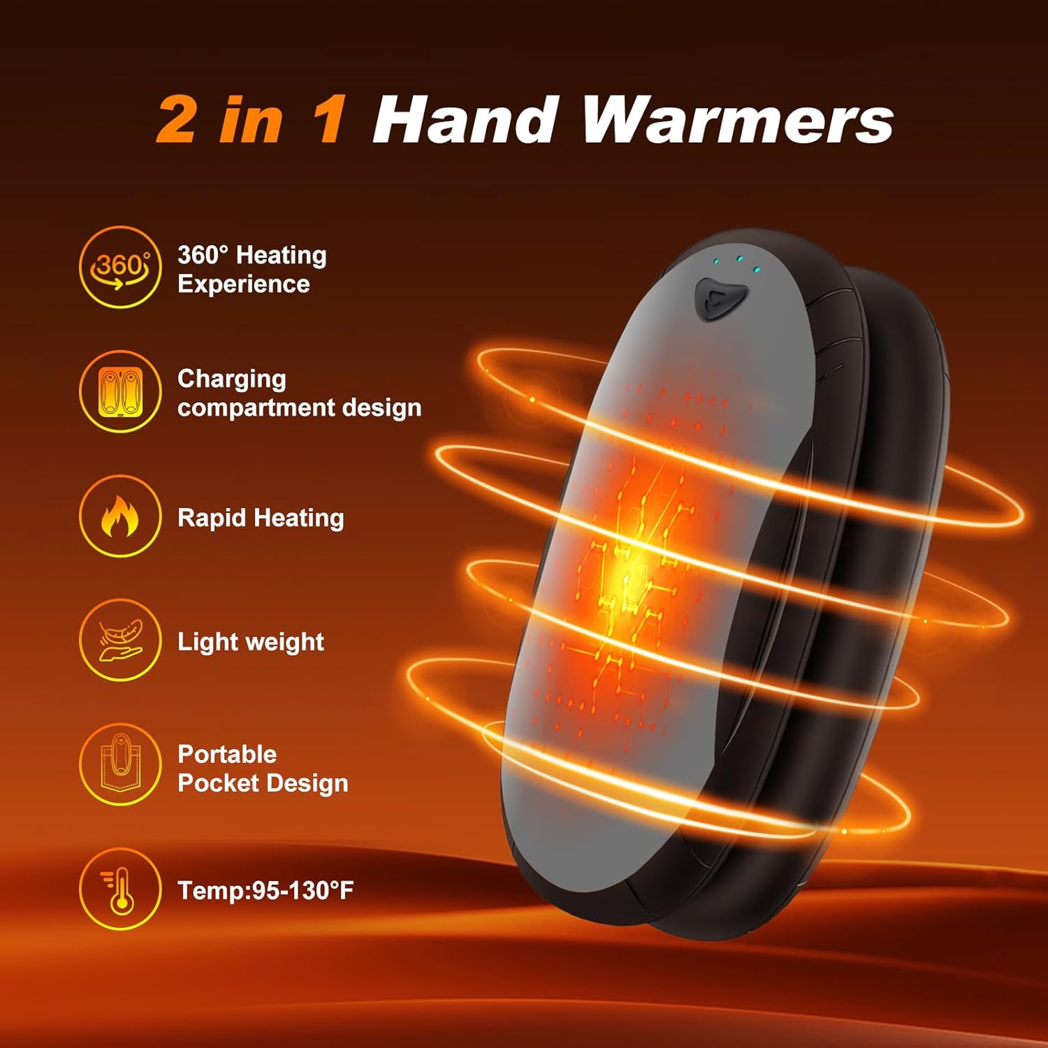 - 【2-in-1 Electric Hand Warmer】 - A set of 2 symmetrical hand warmers that can be combined into a palm-sized hand heater, providing 360-degree warmth for your hands. Alternatively, you can use them separately, each hand holding one, or share one hand warmers with a family. The portable pocket design is suitable for travel, hunting, golf, hiking, camping, skiing, and more