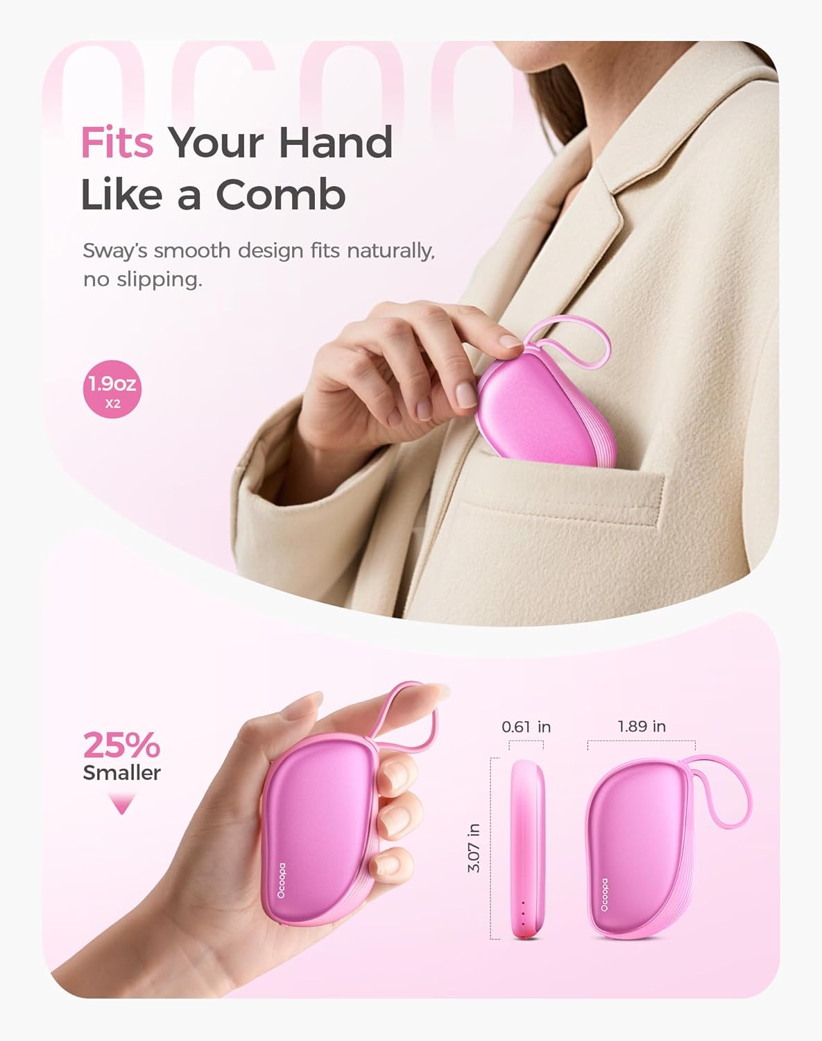 - Inspired by the Comb, Built for Warmth: Inspired by the graceful curves of a royal comb, the UT5 Sway hand warmers blend timeless design with modern heating technology. Heats up in just 3 seconds and delivers steady, single-sided warmth for up to 6 hours with three heat levels. No more bulky or disposable warmers—just compact comfort that goes where you go.
