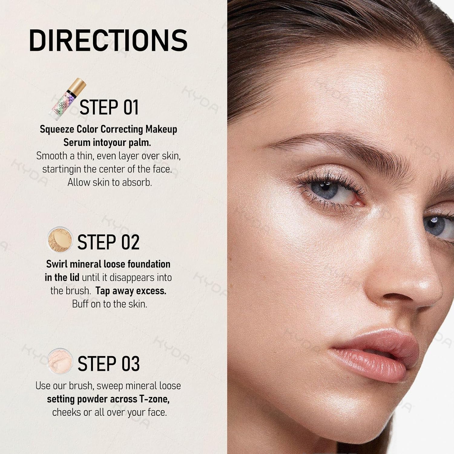 - DIRECTIONS - STEP 1: Squeeze Color Correcting Makeup Serum into your palm. Smooth a thin, even layer over skin, starting in the center of the face. Allow skin to absorb. STEP 2: Swirl Mineral Loose Foundation in the lid until it disappears into the brush. Tap away excess. Buff onto the skin. STEP 3: Use our brush, sweep Mineral Loose Setting Powder across T-zone, cheeks or all over your face.